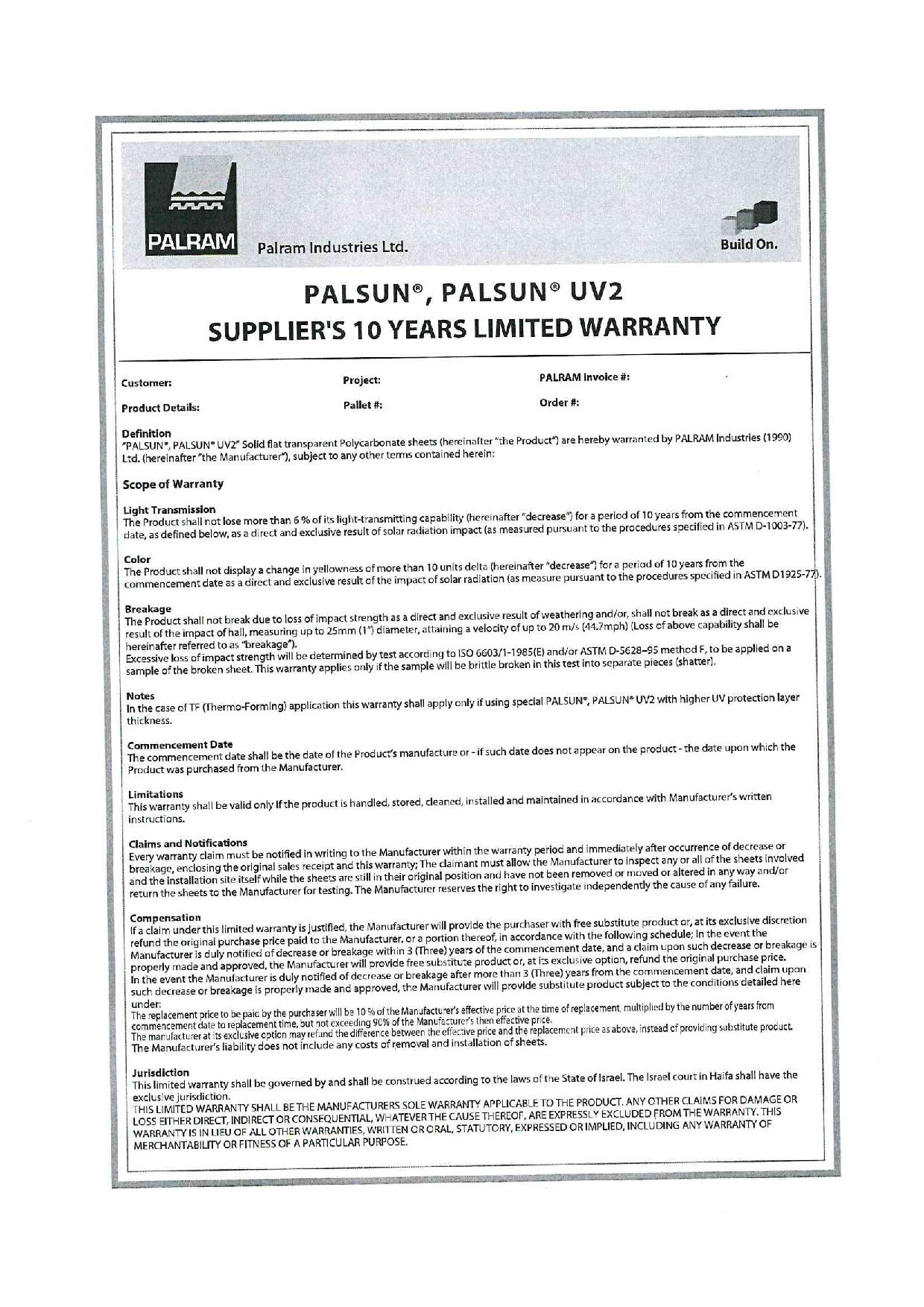 - אנו עובדים עם פוליקרבונט מסוג UV2 כלומר הגנה נגד קרינה והצהבה משני צידי הלוח
