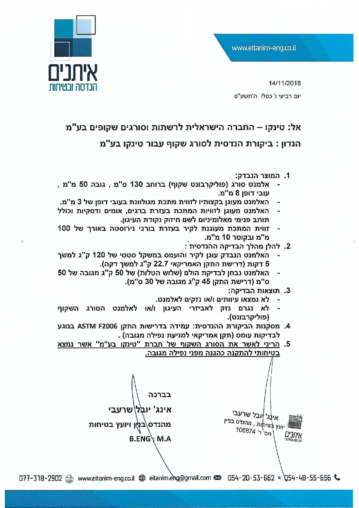 - הסורג שלנו נבחן על ידי חברת "איתנים – הנדסה ובטיחות" ונמצא עומד בכל התקנים המחמירים ביותר. עבר בהצלחה בדיקות עומס ובדיקות הולם של למעלה מפי 5 מהנדרש בתקן האמריקאי המחמיר ASTM F2006!